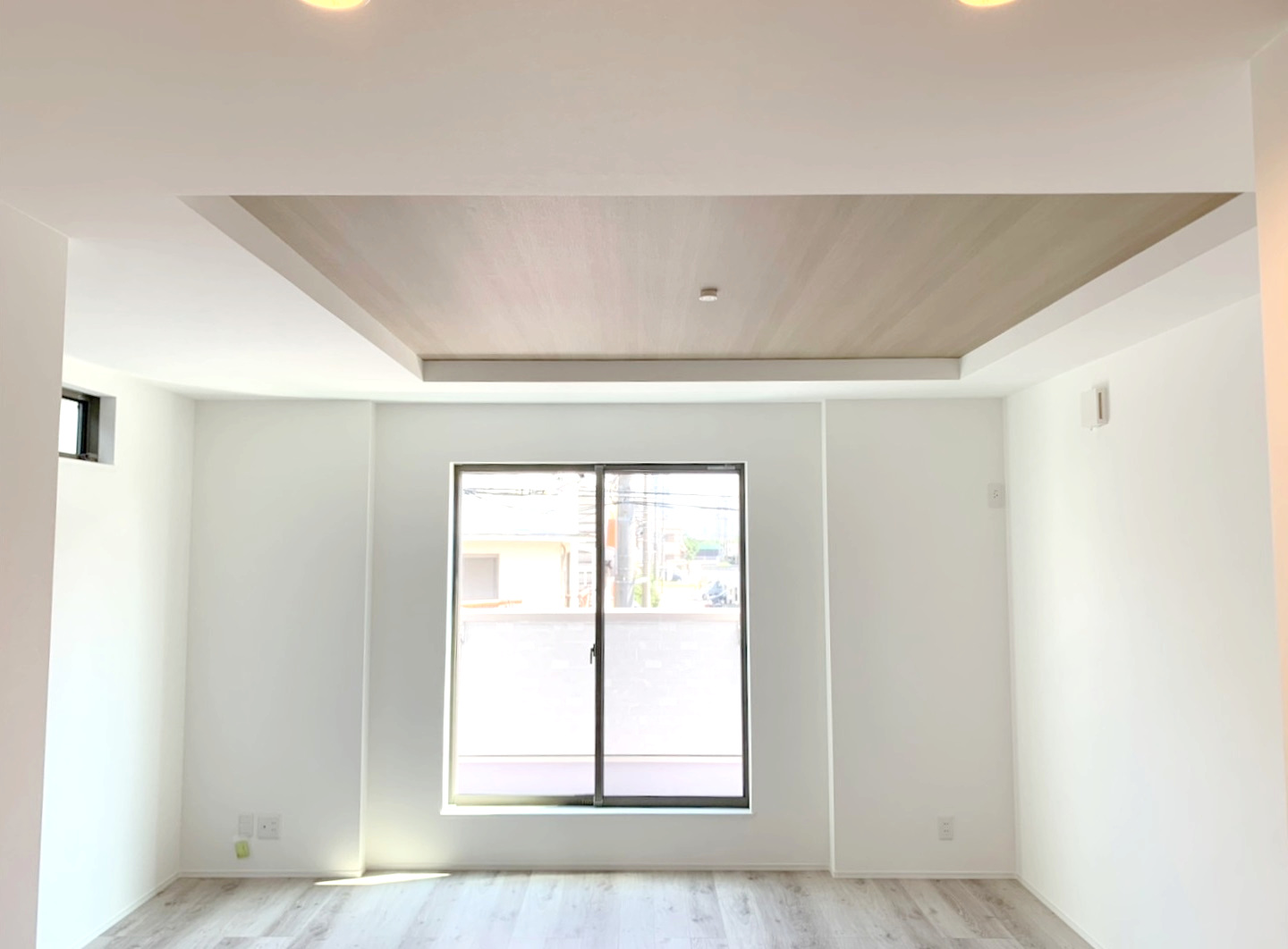 南に面しているLDKには明るい日差しが入り、シンプルな空間にアクセントを持たせた折り上げ天井になっています。