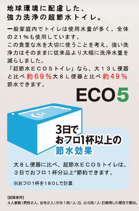 少ない洗浄水量ながら強力に洗い流す超節水便器。超節水ECO5なら8L便器に比べ、年間約6,100円