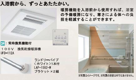冬場の寒さのを軽減し快適なバスタイムを実現します。ランドリーパイプがあるので、洗濯物の室内干しでもしっかり乾かせる浴室用の換気乾燥暖房機です。