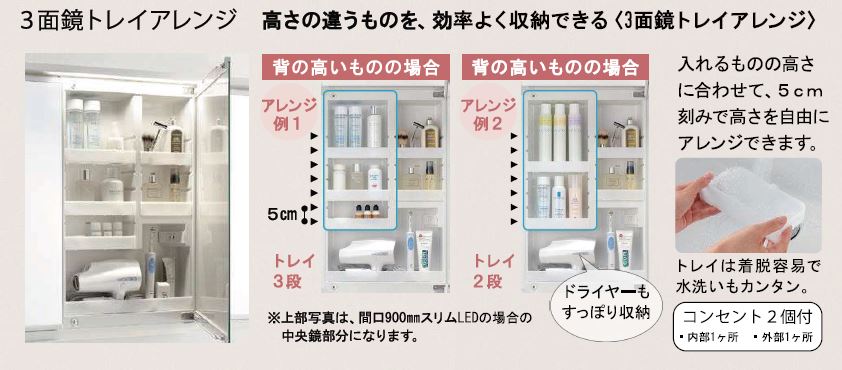 鏡の裏は収納スペース。背の高いものから低いものまで、ピッタリ収納(約4㎝~約24cm)