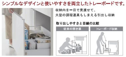 手前の物を一旦出して奥の物を取る・・・従来の開き扉ではなくて、引き出しタイプの収納なので奥の物もサッと取り出せます。